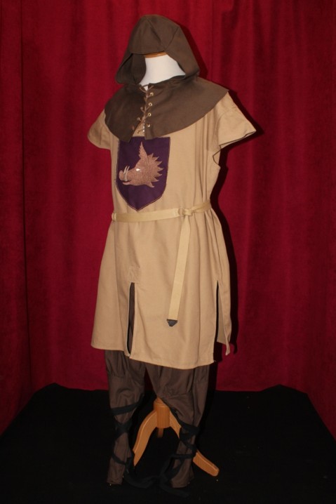 Ce costume évoque la silhouette robuste d’un soldat de garnison ou d’un garde forestier d’un domaine noble. La tunique beige à manches courtes est ornée d’un blason distinctif représentant une hure de sanglier brodée sur un fond violet, symbole de force, de courage et de combativité. Une ceinture crème permet d’ajuster la tenue à la taille, et le camail brun complète l’ensemble avec sobriété.