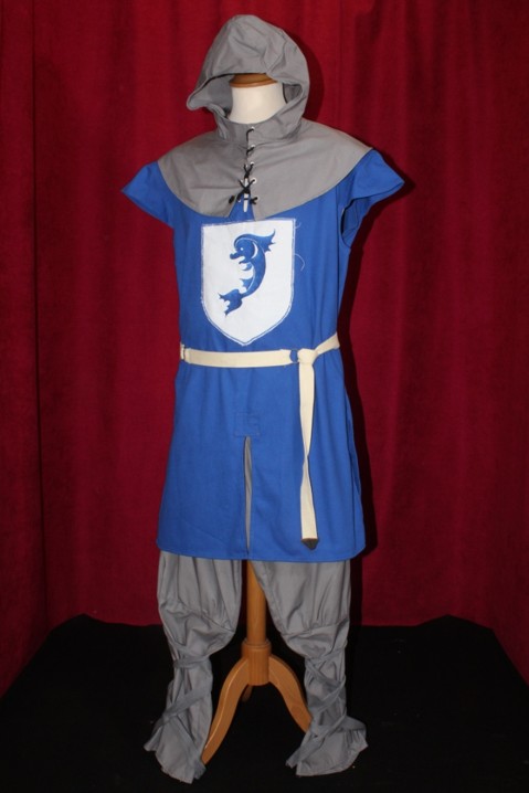 Ce costume évoque les couleurs limpides de l’eau et la noblesse des chevaliers marins. Le surcot bleu vif, sans manches, est orné d’un large blason brodé représentant un dauphin bleu stylisé sur fond blanc. Ce symbole aquatique incarne la fluidité, l’agilité et l’adaptabilité — qualités essentielles pour les chevaliers liés aux rivages, aux ports ou aux royaumes insulaires.