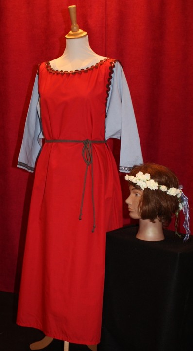 Ce costume féminin d’inspiration médiévale est composé d’une robe rouge sans manches, légèrement évasée, ceinturée à la taille par un cordon vert. Le décolleté est souligné d’un galon festonné bicolore qui apporte une touche raffinée à l’ensemble.