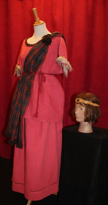 L’harmonie des couleurs (rose, bordeaux, gris, bleu foncé) rend cette tenue à la fois expressive et historique. Elle peut être associée à des accessoires celtiques ou antiques selon l’univers souhaité.