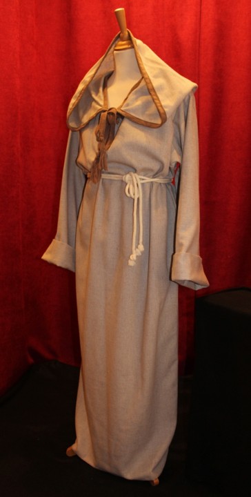 Ce costume évoque l’habit d’un moine, d’un pèlerin ou d’un frère convers, dans une esthétique médiévale sobre et authentique.