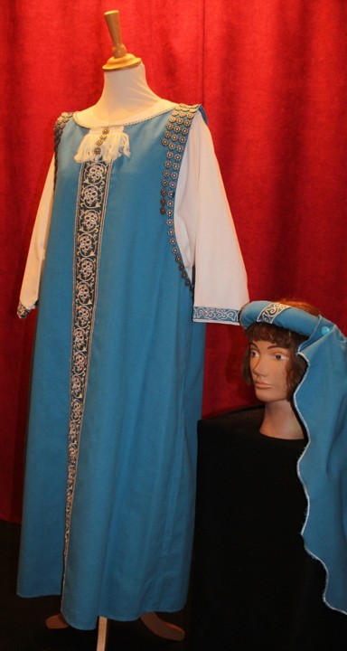 Ce costume médiéval féminin se compose d’une robe blanche à manches trois-quarts surmontée d’un surcot turquoise sans manches. Cette superposition évoque l’élégance des tenues portées par les dames du XIIIe et XIVe siècle.