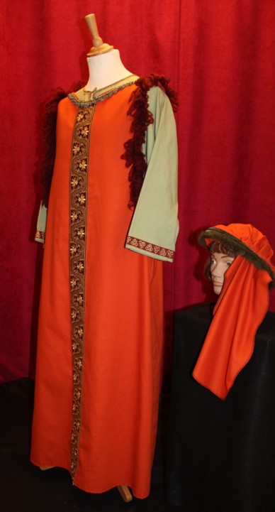 Ce costume médiéval mixte se distingue par l’intensité de ses teintes et la finesse de ses finitions. La cotte longue, d’un orange flamboyant, est ornée d’une bande centrale richement brodée aux motifs dorés et sombres, apportant un contraste noble. Les épaules sont décorées de galons à franges évoquant la parure d’un personnage d’importance.