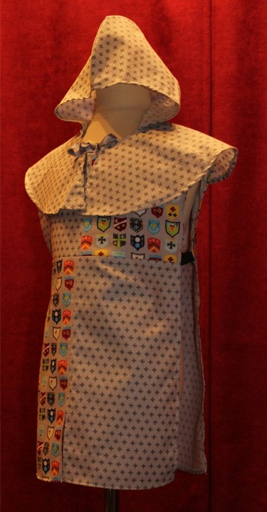 Costume original de petit chevalier composé d’une tunique sans manches en tissu imprimé de blasons colorés et motifs héraldiques, accompagnée d’une grande collerette et d’une capuche à pointe assortie. Disponible en tailles : 3/4 ans, 6 ans, 8 ans, 10 ans.
