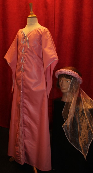 Ce costume de demoiselle médiévale, réalisé dans un tissu rose lumineux, évoque l’élégance des jeunes nobles des cours médiévales. Il se distingue par plusieurs éléments délicats :