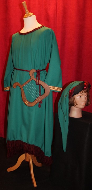La coiffe assortie, réalisée en tissu vert et noir avec une touche de rouge, ajoute une touche d’authenticité et de raffinement à l’ensemble. La harpe en bois (non fonctionnelle) est un accessoire de scène idéal pour incarner un(e) troubadour, jongleur, ou poète itinérant(e).